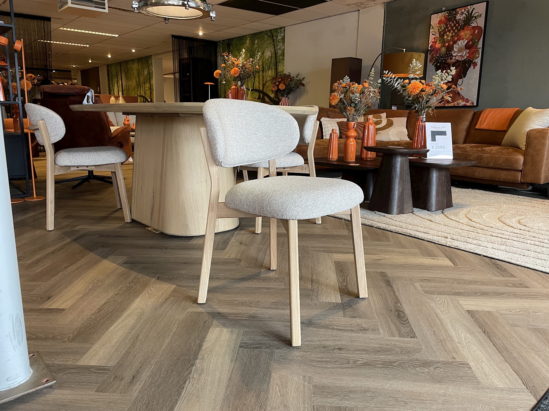 De eetkamerstoelen Ella zijn net nieuw in onze collectie! Ze zijn erg luchtig en ogen zacht en passen daarom in elk interieur. De stoelen zijn leverbaar in 2 kleuren stof en 2 kleuren poten. Ze kosten maar €259,- per stuk!