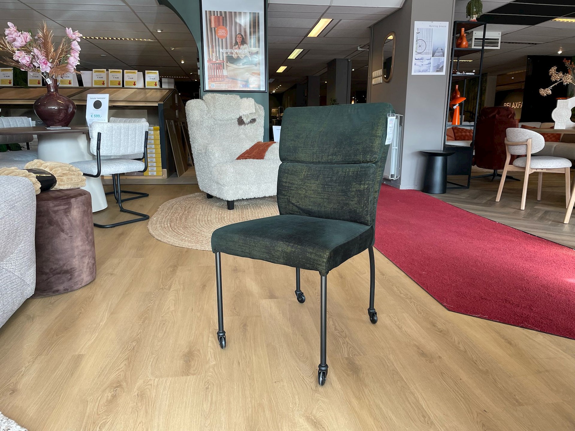 Eetkamerstoel Lotte heeft een goed zitcomfort door de extra kussens. Ook is ze erg functioneel door de wieltjes. Ze heeft geen armleuningen, de eetkamerstoel Lieke is met armleuningen. Ze is in diverse kleuren en stoffen leverbaar.