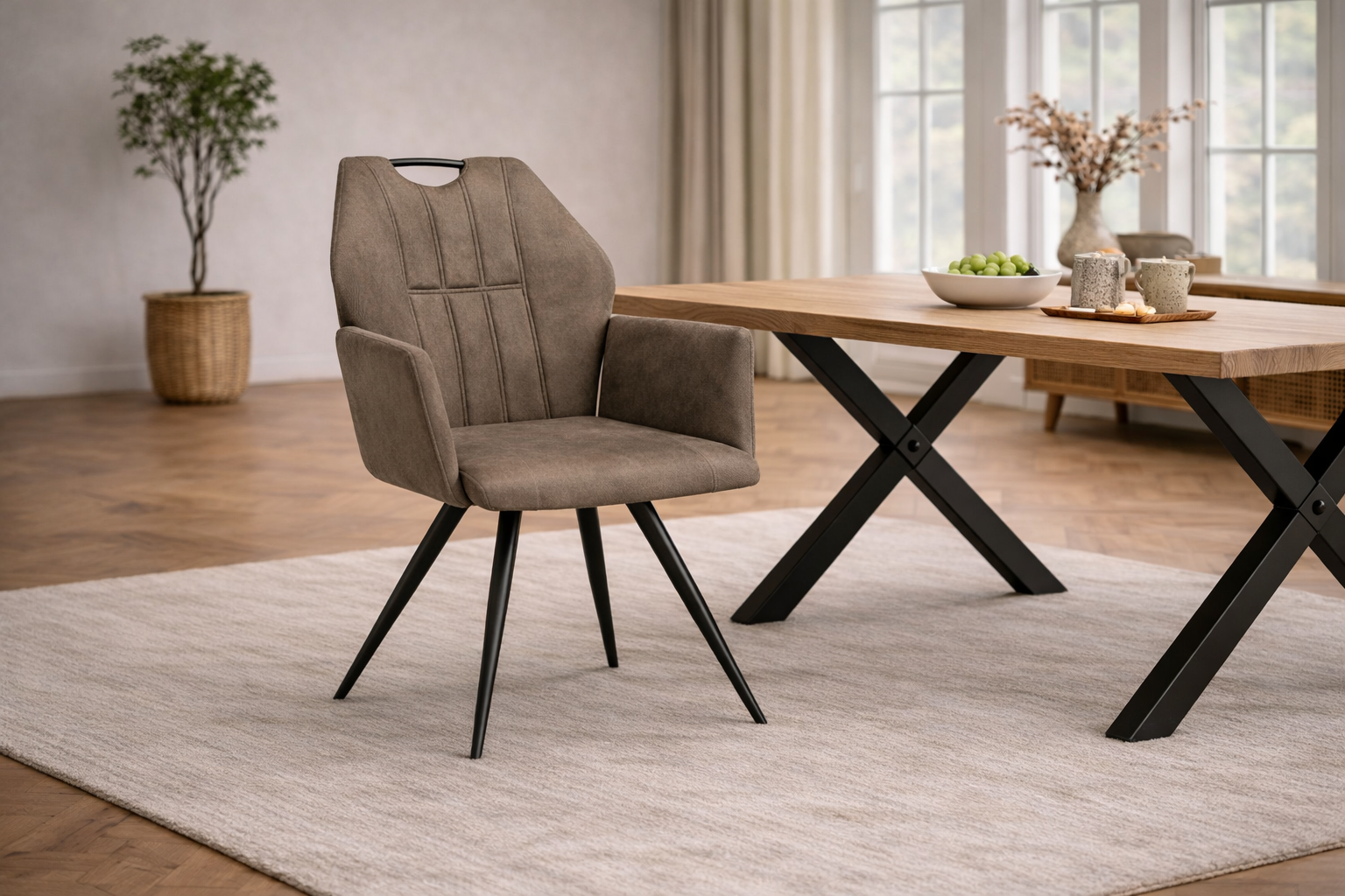 Dit is de eetkamerstoel Puck. Een prachtige stoel waar u heerlijk in kunt zitten tijdens het eten. De stoel is leverbaar in de kleuren taupe, sand, moss, cognac, clay en anthracite.