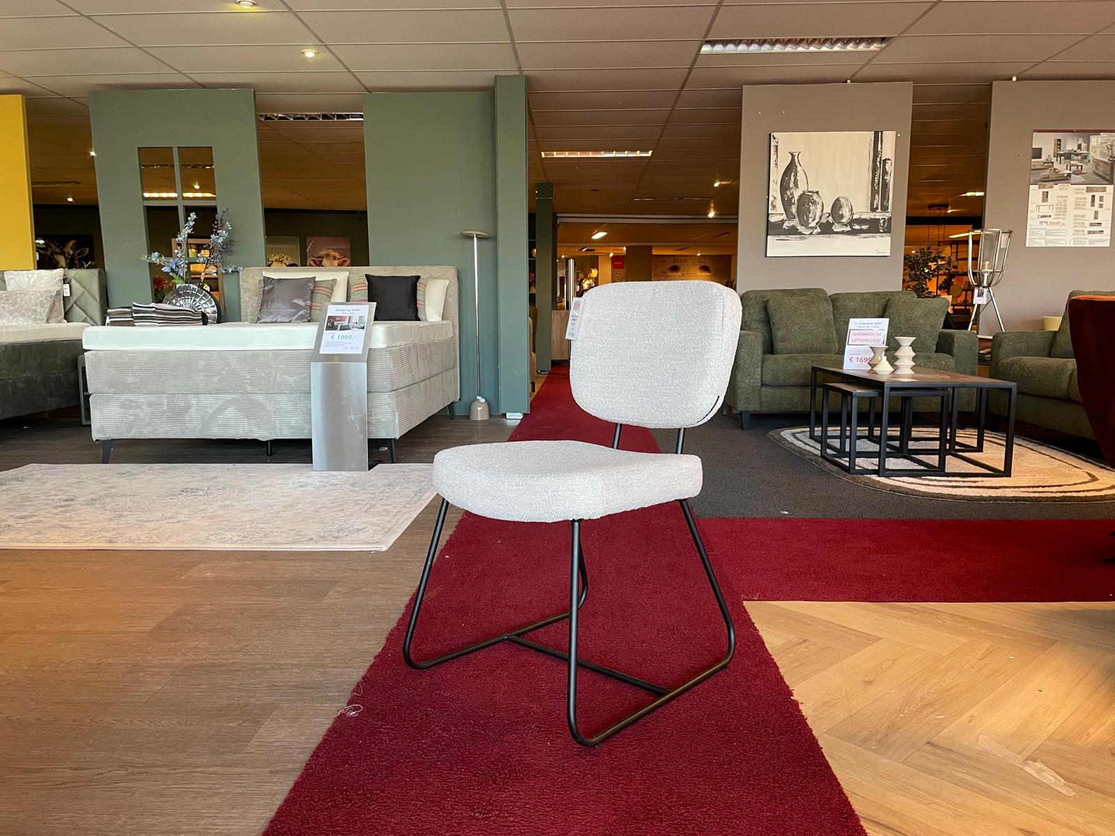 De eetkamerstoel Wesley is in de winkel bekleed met een luxe bouclé stof en heeft een zwart minimalistisch stalen frame. De stoel is ook verkrijgbaar in andere stoffen en kleuren.