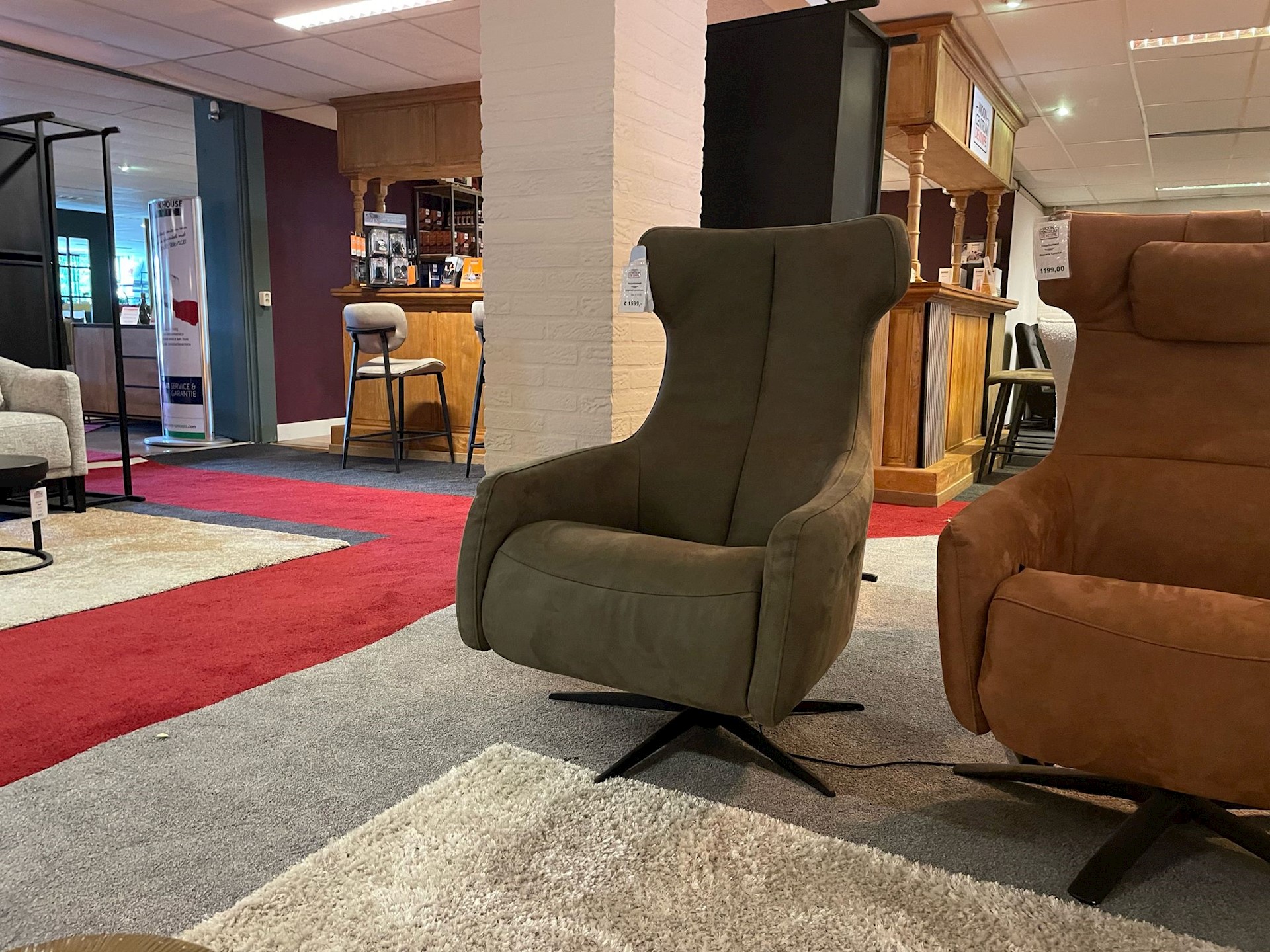Dit is de mooie relaxfauteuil 7687. Hij is leverbaar in diverse maten en in diverse stoffen. Ook heeft u keuze uit verschillende poten en een elektrische of handmatige bediening. Het showroom model is met een elektrische bediening.