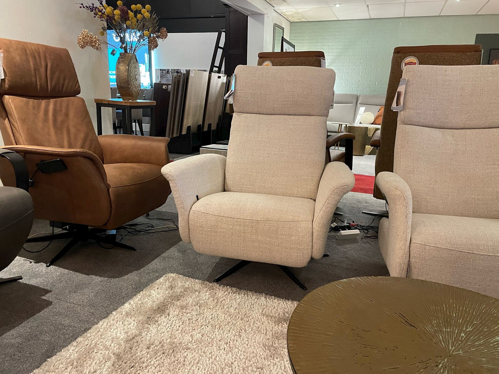 Dit is de mooie relaxfauteuil 7079. Hij is leverbaar in diverse maten en in diverse stoffen. Ook heeft u keuze uit verschillende poten en een elektrische of handmatige bediening. Het showroom model is met een handmatige bediening.