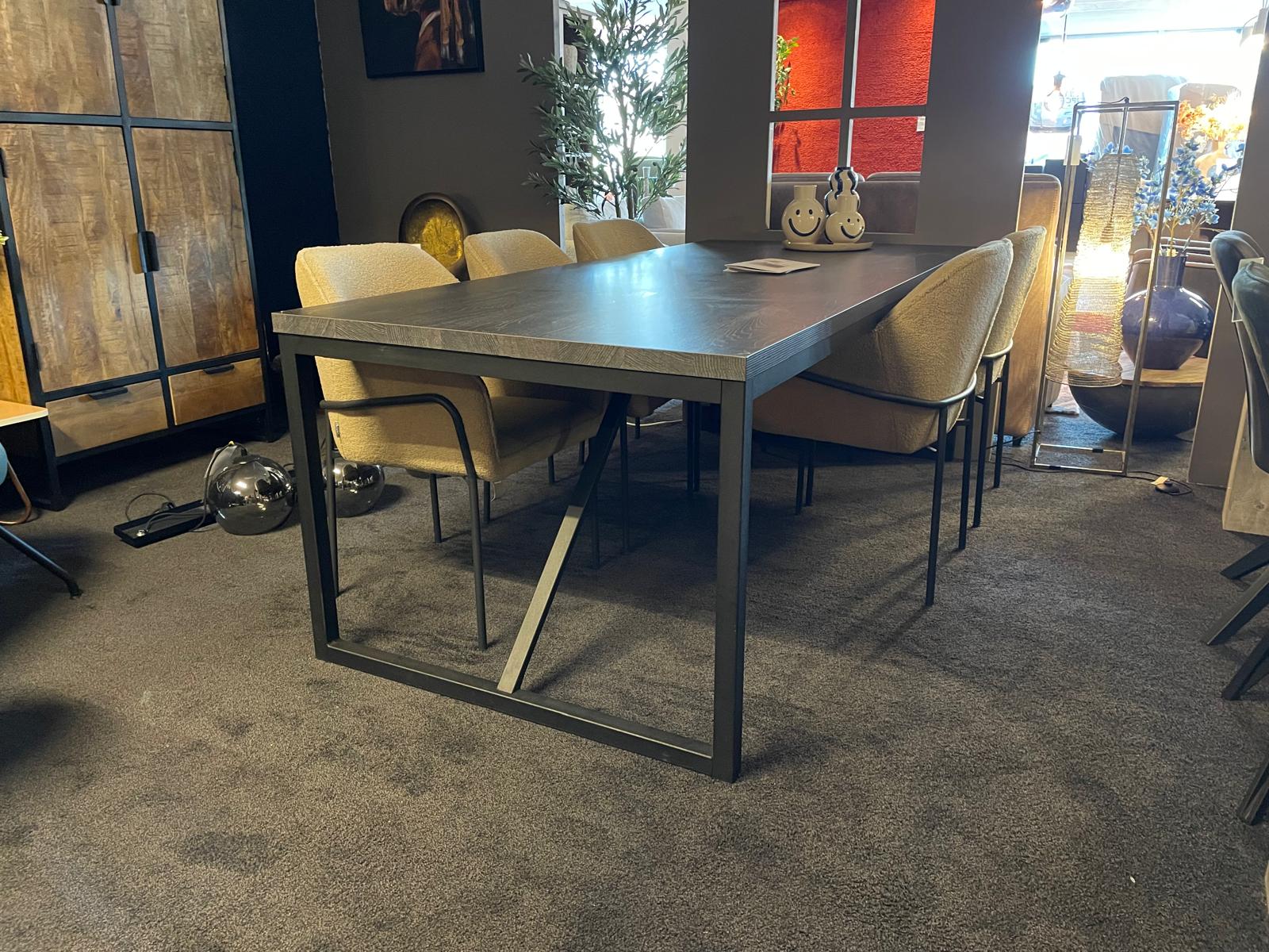 De Pelle tafel heeft een donkerbruin tafelblad en een zwart U-vormig onderstel. De tafel kost nu €459,- in plaats van €529,- Leverbaar in diverse afmetingen.