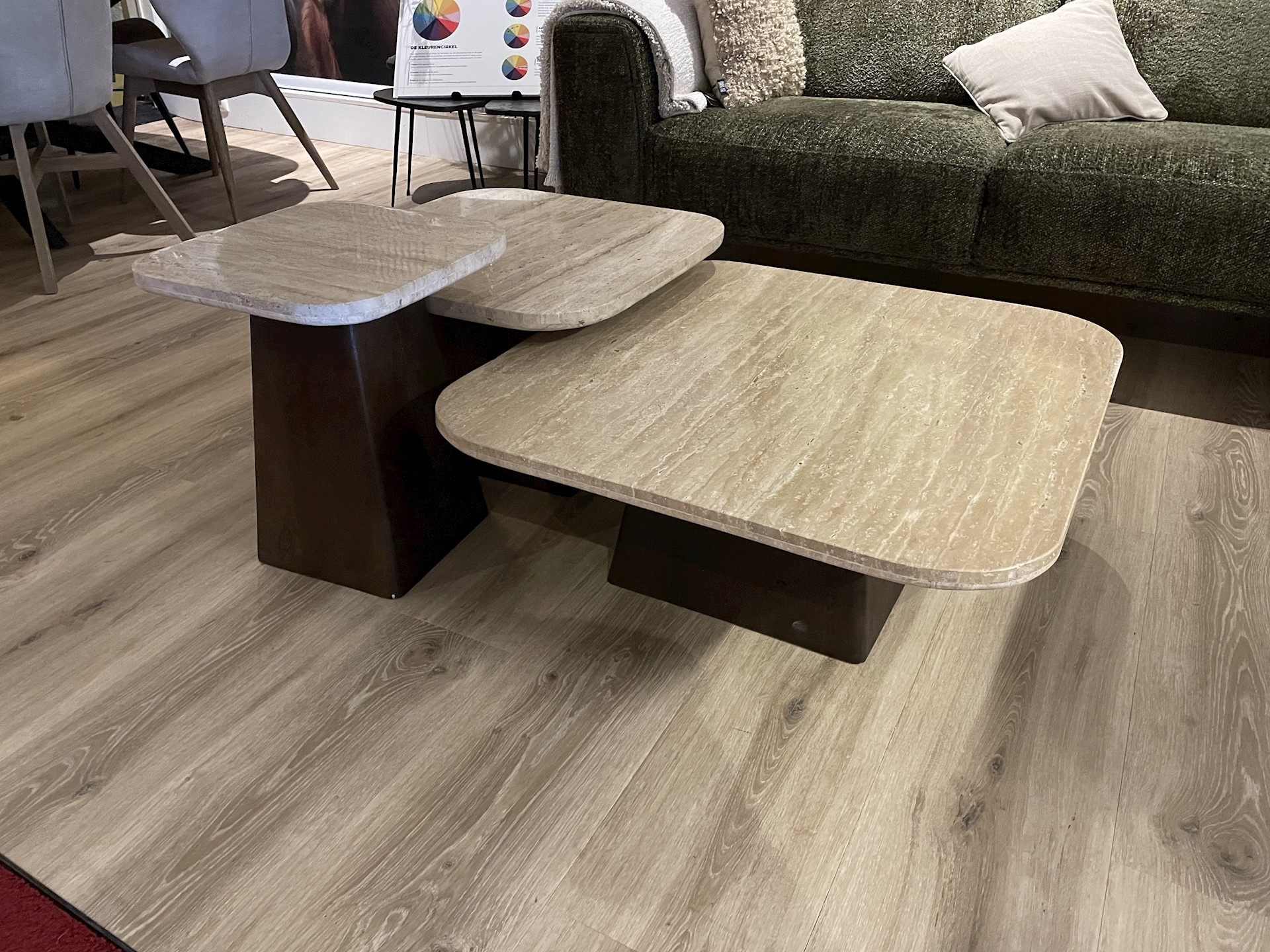 Dit is de salontafelset Travis. Prachtig als set, maar ook als individueel tafeltje. De tafeltjes hebben een travertine blad en een mango houten poot.