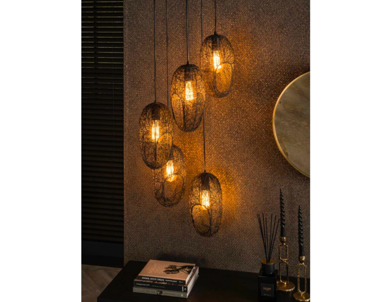 Deze hanglamp heeft vijf half open kappen. Het licht schijnt op een subtiele manier door de kap heen. De kappen kunnen op ongelijke hoogtes worden gehangen wat een speels effect geeft.