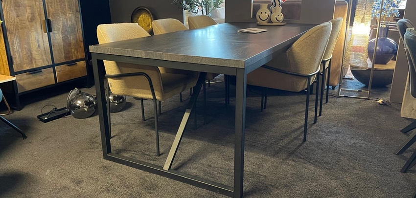 De Pelle tafel heeft een donkerbruin tafelblad en een zwart U-vormig onderstel. De tafel kost nu €459,- in plaats van €529,- Leverbaar in diverse afmetingen.