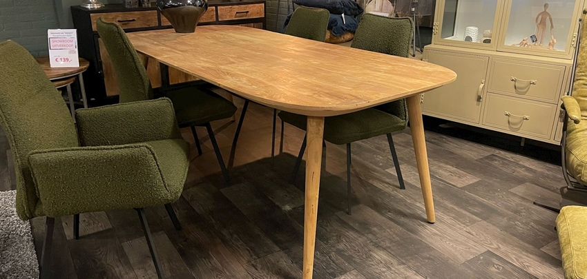 De Tabassum eettafel heeft een tonvorm. De tafel heeft een houtstructuur, en is gemaakt van gerecycled teak-hout. Hij is verkrijgbaar in verschillende maten. De maat 220 cm wordt als showroom model verkocht en kost dan €999,-