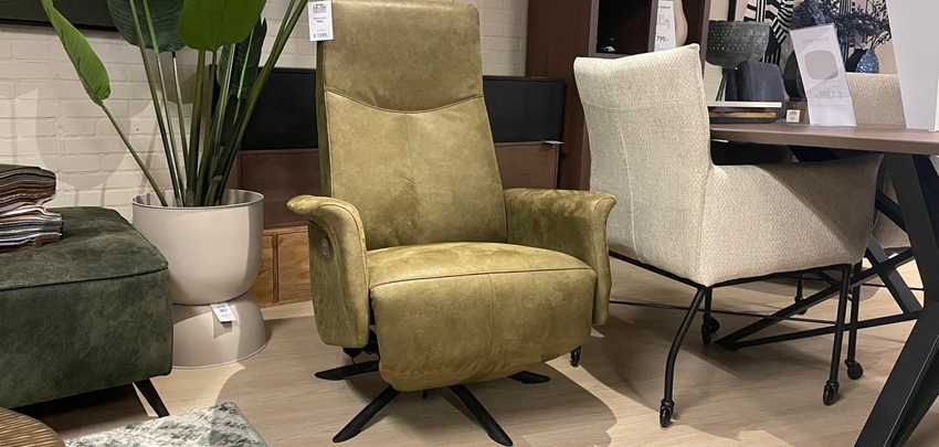 Dit is de mooie relaxfauteuil Peru. Hij is leverbaar in diverse kleuren en stoffen. Ook heeft u keuze uit verschillende poten en een elektrische of handmatige bediening. Het showroom model is met een elektrische bediening.
